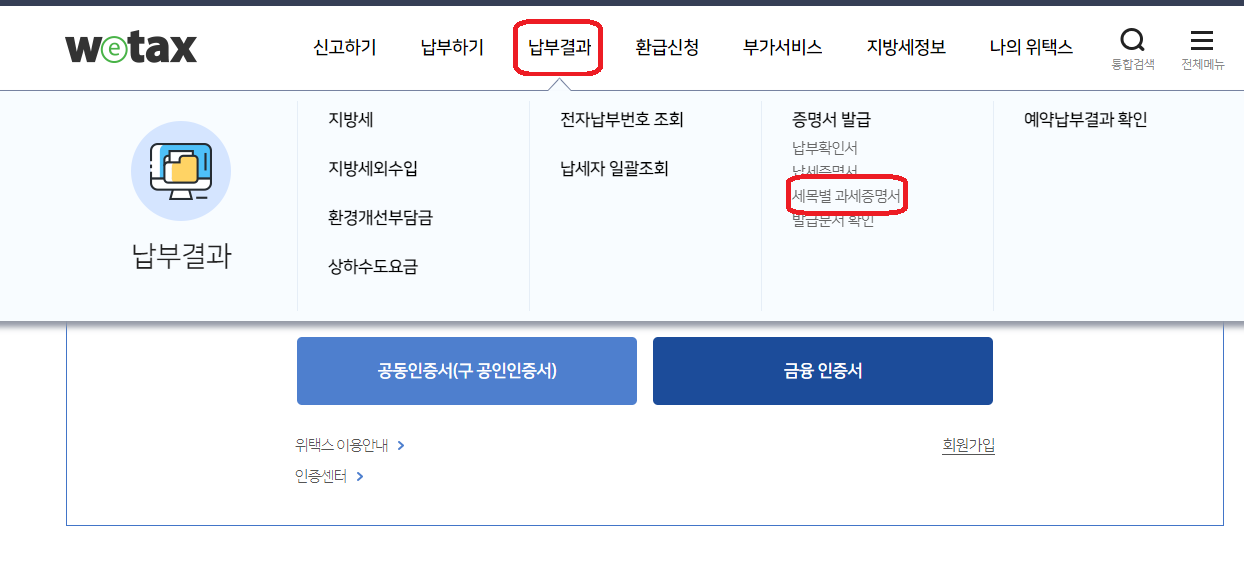 ※지방세 세목별(재산세) 미과세 증명서 온라인 발급으로 들어가시면 위택스로 이동합니다. 공인인증, 금융인증, 간편 인증으로 로그인하시고 아래 방법대로 들어가셔서 발급받으시면 됩니다.