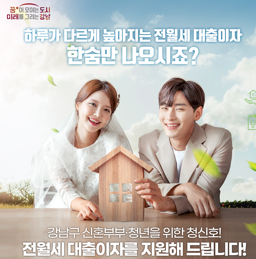 하루가 다르게 높아지는 전, 월세 대출이자에 힘들어하는 신혼부부와 청년을 위해 강남구가 "강남구와 함께 만드는 신혼부부도 청년도 행복한 우리 집!' 사업을 시행합니다. 전, 월세 대출이자를 지원하는 이번 사업의 지원자격, 지원혜택, 신청방법에 대해 알아보겠습니다.