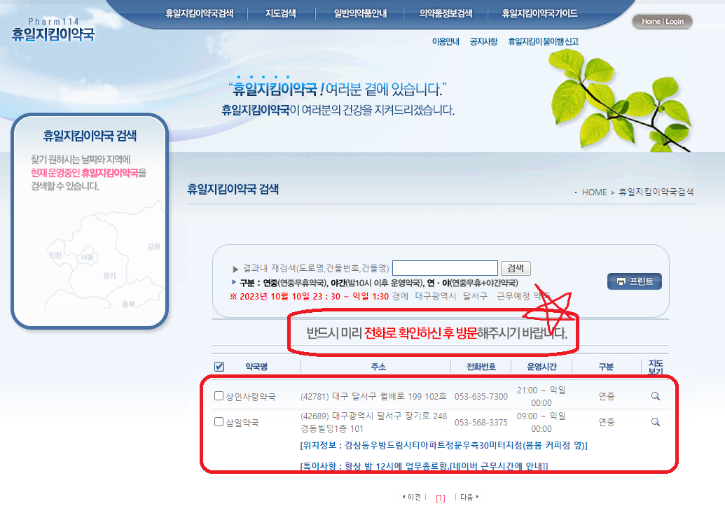 3. 검색된 약국에 전화로 확인하시고 방문