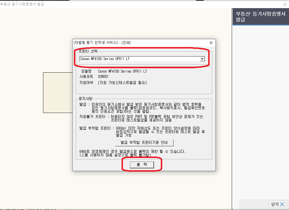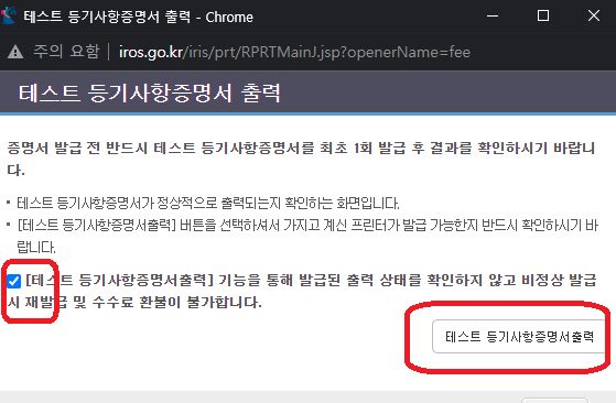 10. 다음화면에 나오는 '테스트등기사항증명서 출력' 동의 후 출력을 클릭합니다.