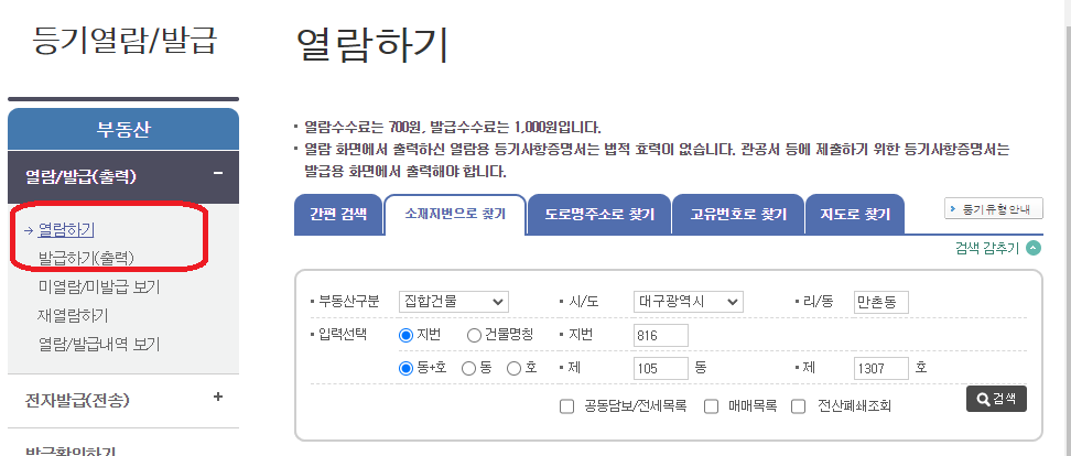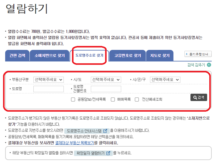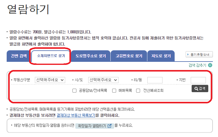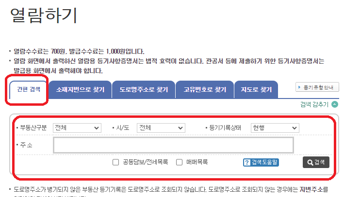 6. 편한 방법으로(간편 검색, 소재지번으로 찾기, 도로명주소로 찾기 등) 부동산구분과 주소를 입력해 검색을 합니다.