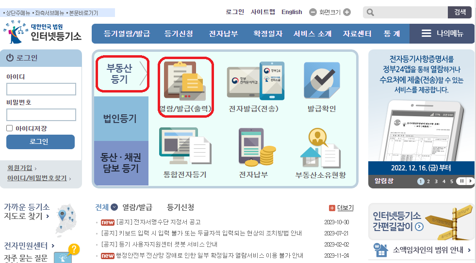 3. 홈페이지에서 '부동산 등기' '열람/발급(출력)'을 클릭합니다.