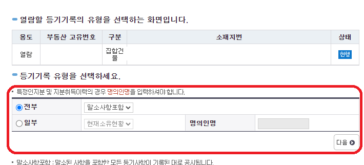 8. 등기부 기재 사항을 선택 후에 '다음'을 클릭합니다.
