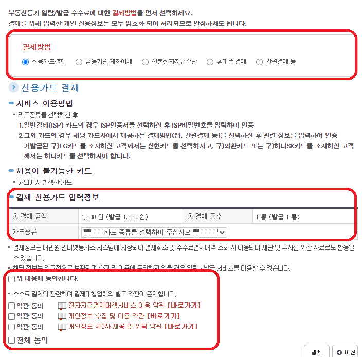13. 결제방법 선택 후 정보 이용 동의 후 결제를 클릭합니다.