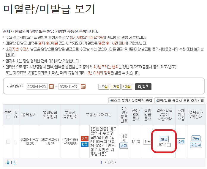 5. 열람하기와 발급하기를 선택합니다.(열람은 인터넷으로 볼 수만 있고 발급하기는 프린터로 인쇄가능합니다.)
