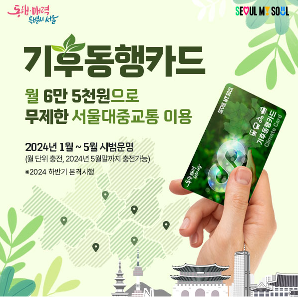 서울시에서 기후위기에 대응하고 시민들의 경제적 부담을 덜어주기 위해 월 65,000원으로 서울 대중교통을 무제한 이용할 수 있는 기후동행카드를 2024년 1월 ~ 2024년 5월 동안 시범 운영되고 2024년 하반기부터 정식 서비스를 시작합니다. 교통카드 하나로 서울 시내 지하철, 시내버스, 마을버스, 공공자전거 따릉이까지 무제한으로 이용할 수 있는 서울시 기후동행카드 신청방법 및 사용 가능지역에 대해 알아보겠습니다.