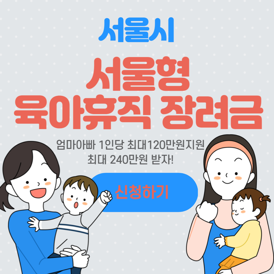 서울시가 육아휴직하는 엄마아빠들의 아이 키우며 일과 생활을 조화롭게 하고자 경제적 부담을 줄일 수 있도록 1인당 120만원씩 최대 240만원의 서울형 육아휴직 장려금을 지원합니다. 서울형 육아휴직 지원내용, 신청방법, 지원대상에 대해 알아보겠습니다.
