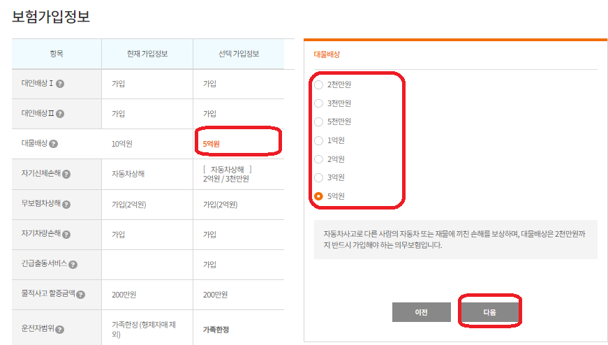 ●대물배상(의무): 자동차손해배상보장법에 의한 의무사항으로 보험가입자가 자동차사고로 인하여 다른 사람의 재물을 없애거나 훼손한 경우에 보험가입금액 한도 내에서 보상합니다. 최저 보상인 2000만원과 최대 보상인 5억원입니다. 요즘은 좋은 차들이 많아서 높은 보장을 선택하였습니다.