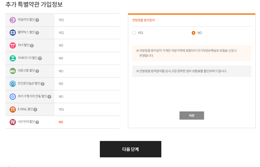 ●첨단안전장치 유무 : 전방충돌 방지장치, 차선이탈 경고장치를 이야기하고 기본옵션으로 붙어 나오는 차종은 자동으로 예에 표시되고 따로 설치하신 분은 예로 바꾸어주셔야 합니다. 역시 할인되오니 잘 되어있나 확인하세요