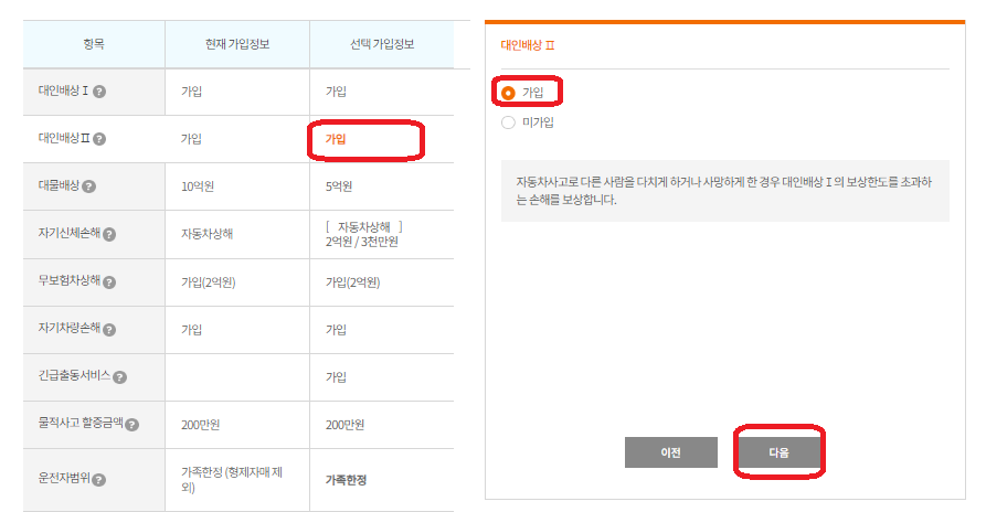 ●대인배상 ll: 보험가입자가 자동차사고로 인하여 다른 사람을 다치게 하거나 사망한 경우 대인배상 l 보상한도액을 초과하는 손해에 대하여 보상합니다. 미가입도 가능하나 혹시나 하고 드는 보험이고 가입하시는 것이 좋습니다.