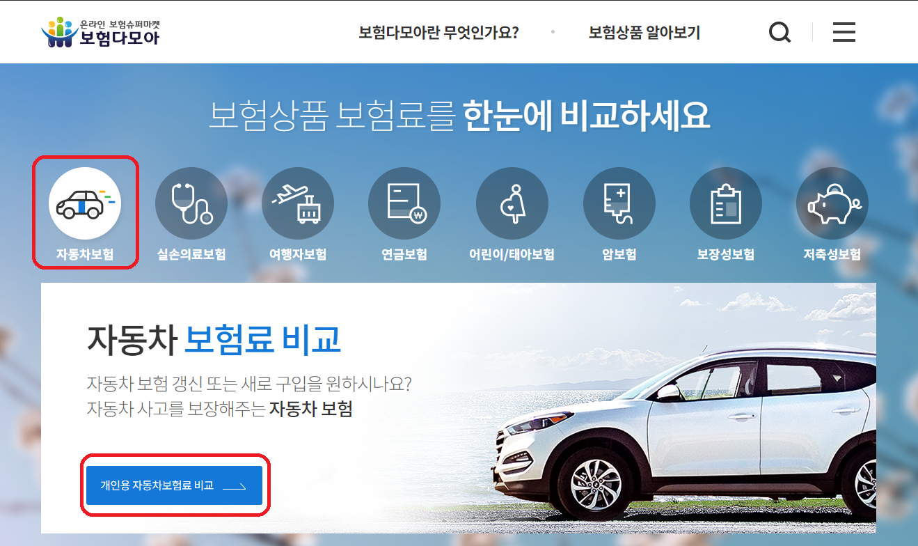 1. '온라인 보험슈퍼마켓 보험다모아' 홈페이지에 접속 후 자동차보험을 클릭합니다.