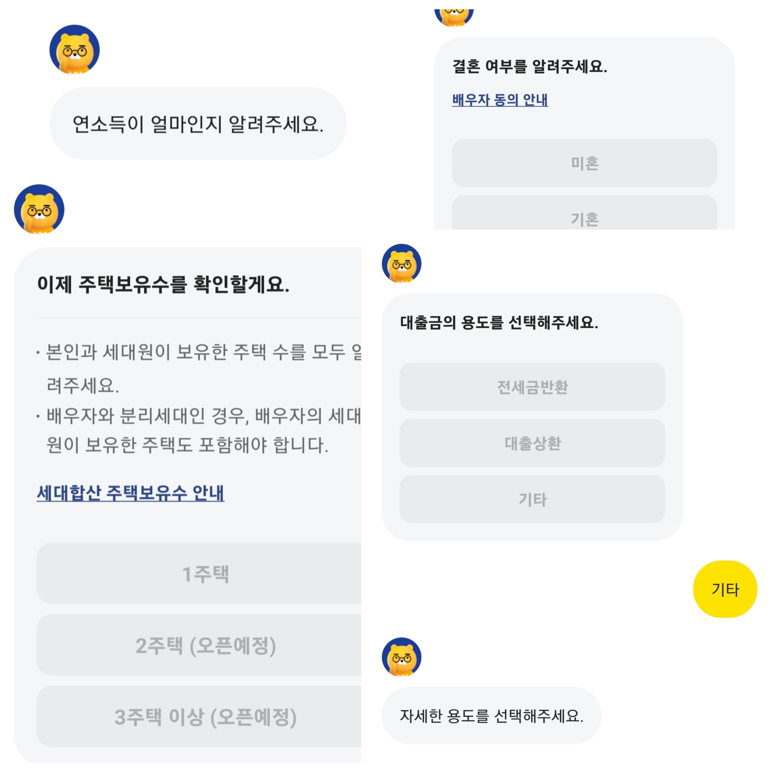 4. 연소득, 결혼유무, 보유주택수, 대출금 용도(생활안정자금대출의 경우는 기타 선택), 상세용도를 입력합니다.