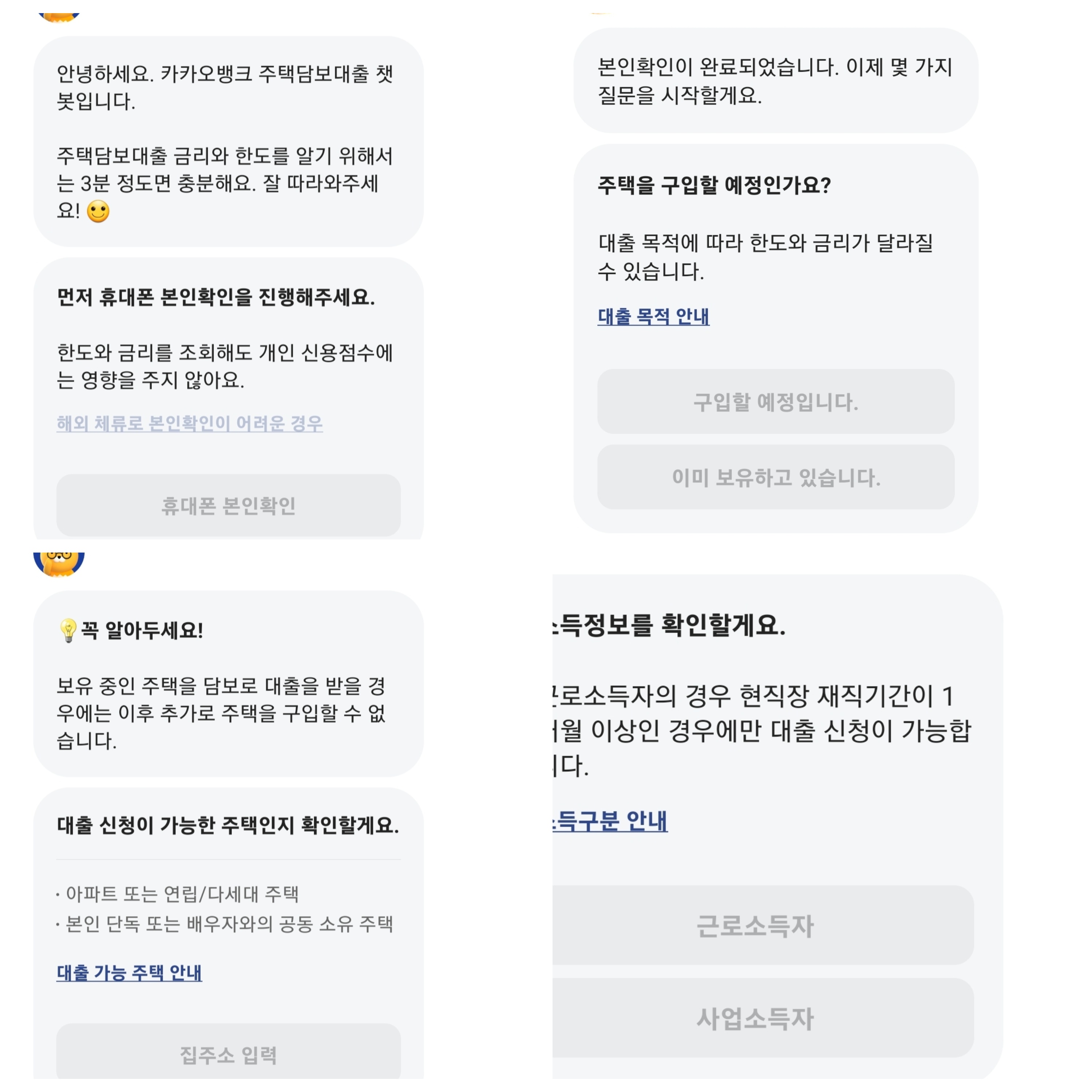 LTV, DTI, DSR 등 규제 범위 내 최대 10억 원의 대출한도로 금리 또한 여러 조건에 따라 달라지는데요 이러면 제가 카카오뱅크를 설명할 이유가 없겠죠 카카오뱅크의 장점이라고 할 수 있는 쉽게 몇 가지 정보만 입력하시면 바로 두루뭉술한 대출한도와 금리가 아닌 나의 정확한 대출한도와 금리를 바로 확인하실 수 있습니다. 자세한 방법은 아래에 설명하겠습니다