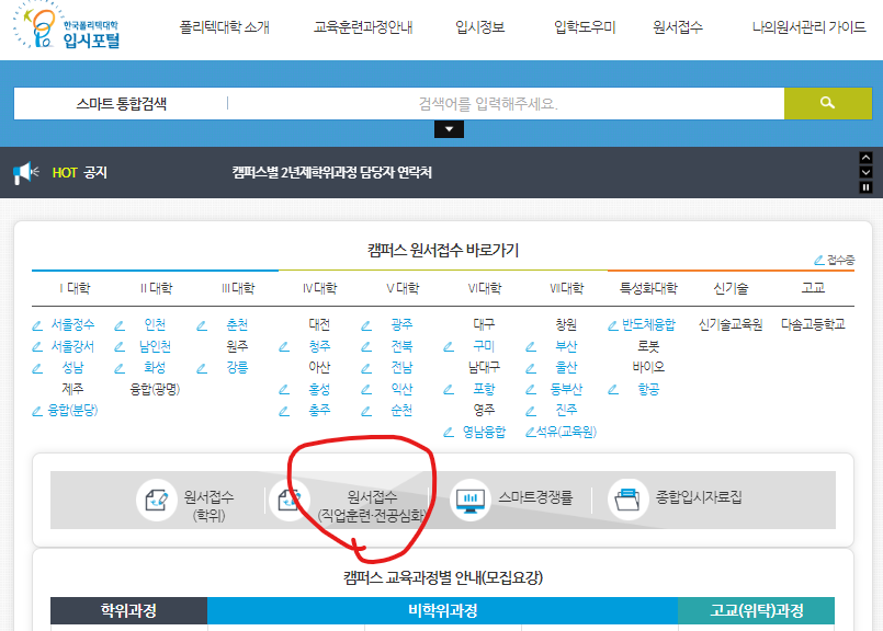 3. 입시요강을 확인하셨다면 다시 홈페이지 첫 화면으로 오셔서 원서접수(직업훈련, 전공심화)를 클릭하고 들어가셔서 원하는 과정을 선택해 원서를 작성하시면 됩니다.