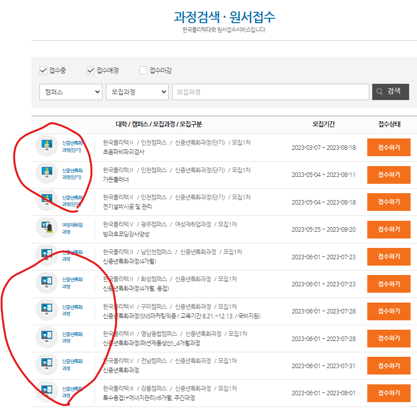 폴리텍대학 신중년과정 교육기간은 3개월과 6개월 교육과정이 있으며 대부분이 설비관리, 건설기계, 공조냉동, 전기설비, 특수용접, 자동차복원, 시니어헬스케어, 패션제품생산등 자격취득에 따라 재취업을 돕는 직업 훈련입니다. 전국 35개 캠퍼스에서 2500명을 대상으로 교육을 진행합니다.