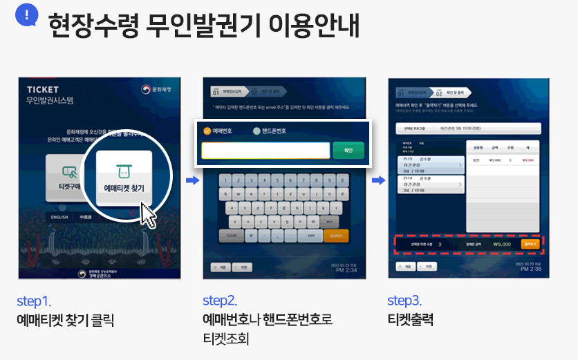 ※ 티켓 예매 후 관람 당일 광화문 매표소의 무인발권기에서 티켓 수령 후 입장( 민속박물관 매표소, 영추문 매표소, 신무문 매표소 발권 및 입장 불가)