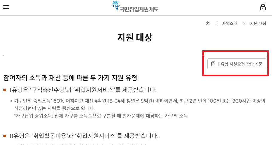 | ●요건심사형: 15~69세 구직자중 가구단위 중위소득 60%이하이고 재산 4억원(18~34세 청년은 5억원 이하) 이하이면서,최근 2년 안에 100일 또는 800시간 이상의 취업경험이 있는 사람 ●선발형: 요건심사형 중 취업경험요건을 충족하지 못한 사람(단 18~34세의 청년은 가구단위 중위소득 120% 이하이고 재산5억원 이하이면 취업경험 무관) |