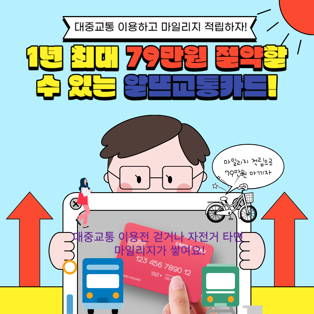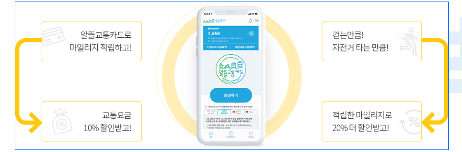 대중교통을 이용하기 위해 걷거나 자전거로 이동한 거리만큼 마일리지를 적립하여 지급하고, 아울러 카드사의 추가할인 혜택을 포함하여 대중교통비를 최대 30% 절감할 수 있게 한 교통카드입니다. 2023년 7월부터 최대 60회 이용분까지 적립되어 월 48000원에서 66000원으로 늘어나 1년 최대 79만 원까지 적립이 됩니다.