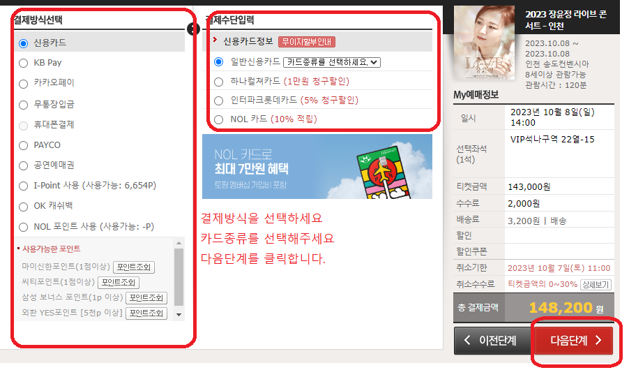 6. 티켓수력방법 선택, 예매자 정보 입력, 프리미엄서비스 선택, 배송주소 등록 후 다음단계를 선택합니다.