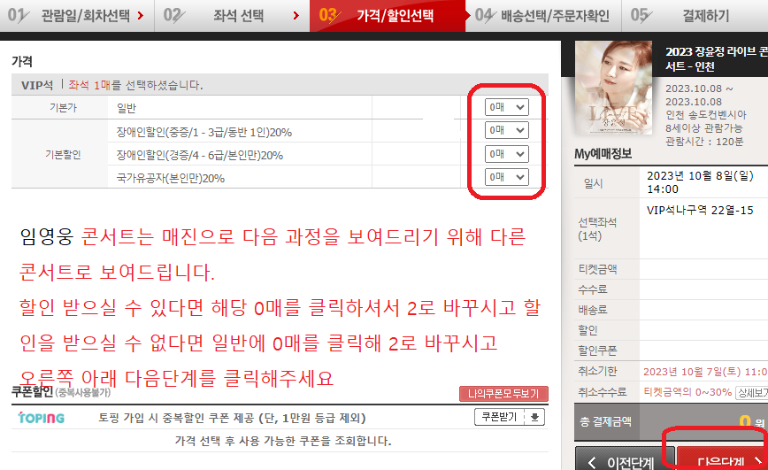 5. 할인 가능한 분은 해당칸 0매를 2매로 바꾸시고 할인 가능하지 않다면 일반에 0매를 2매로 바꾸어주세요.