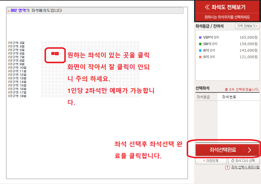 6. 선택된 구역에서 원하는 좌석을 선택 후 좌석 선택 완료를 클릭합니다.