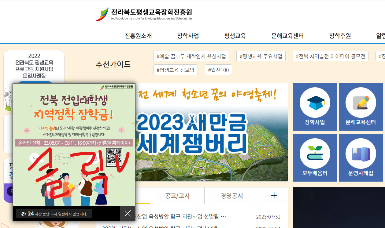 위 베너를 클릭하시면 전라북도평생교육장학진흥운 홈페이지로 이동하고 홈페이지 화면에서 클릭이라고 표시된 부분을 클릭하시면 신청화면으로 바로 넘어갑니다.