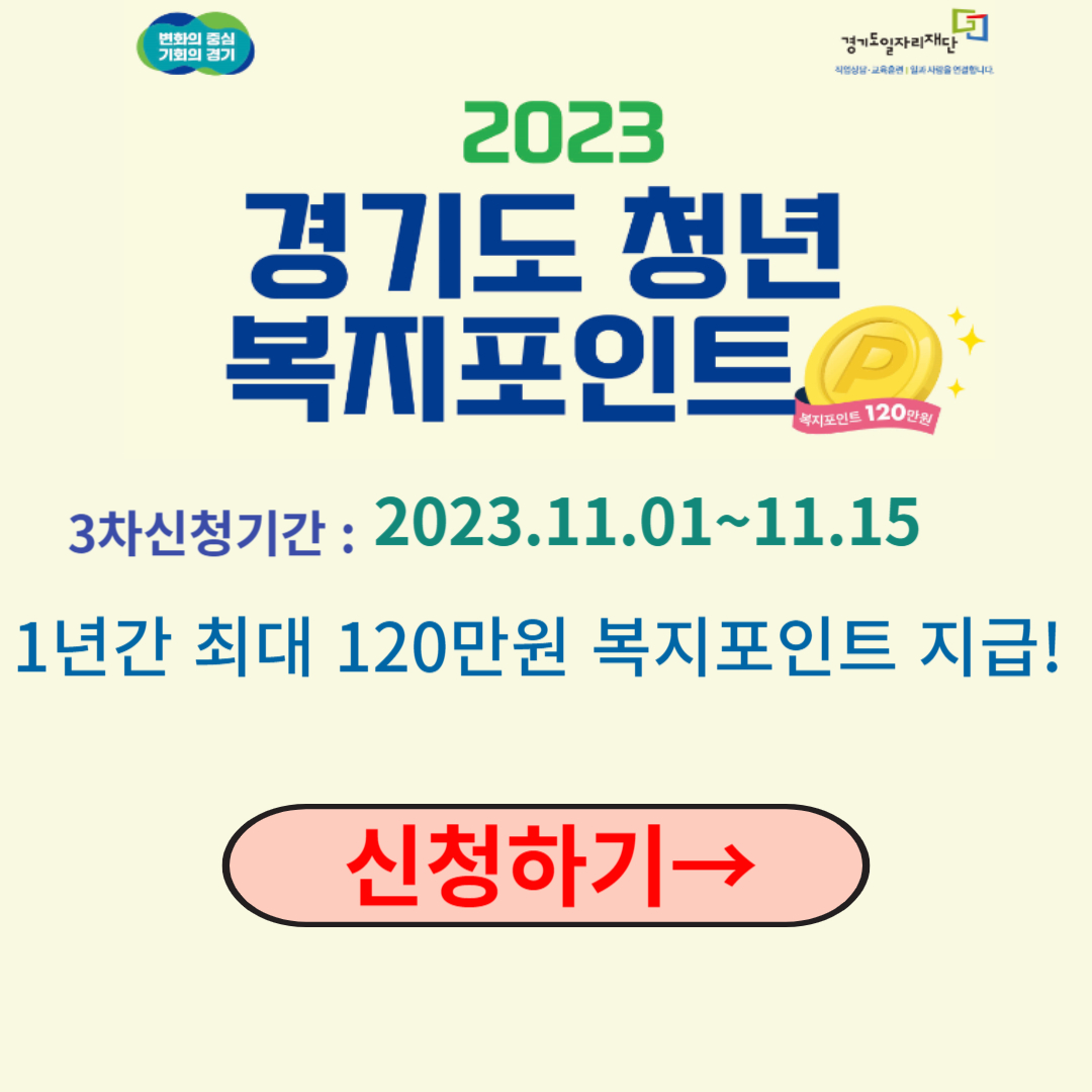경기도 청년 복지포인트는 1년에 120만 복지포인트를 받을 수 있습니다. 4월과 7월에 1차, 2차 신청을 놓치신 분이라면 이번 3차에 꼭 신청하셔서 혜택 받아보시면 좋겠습니다.