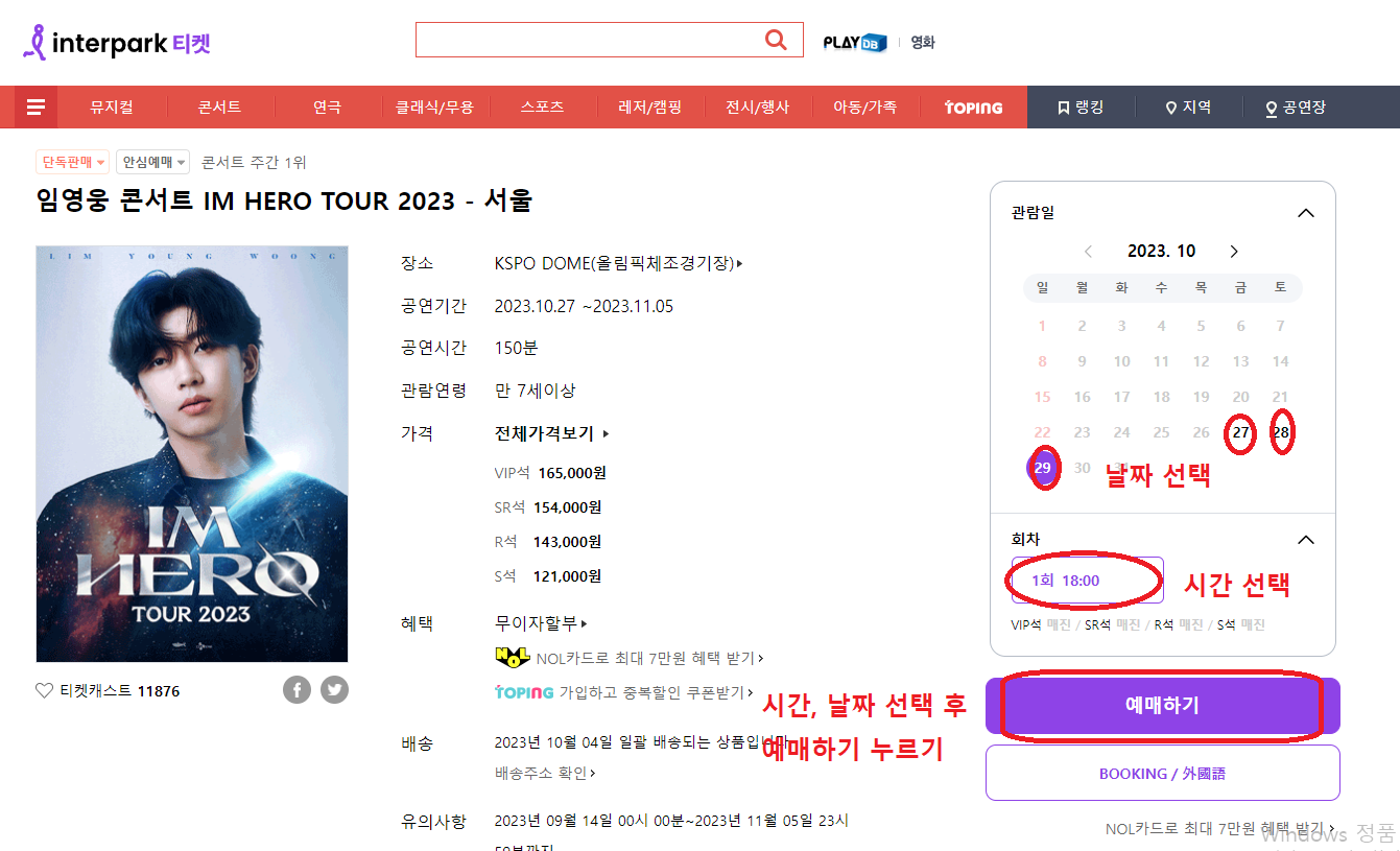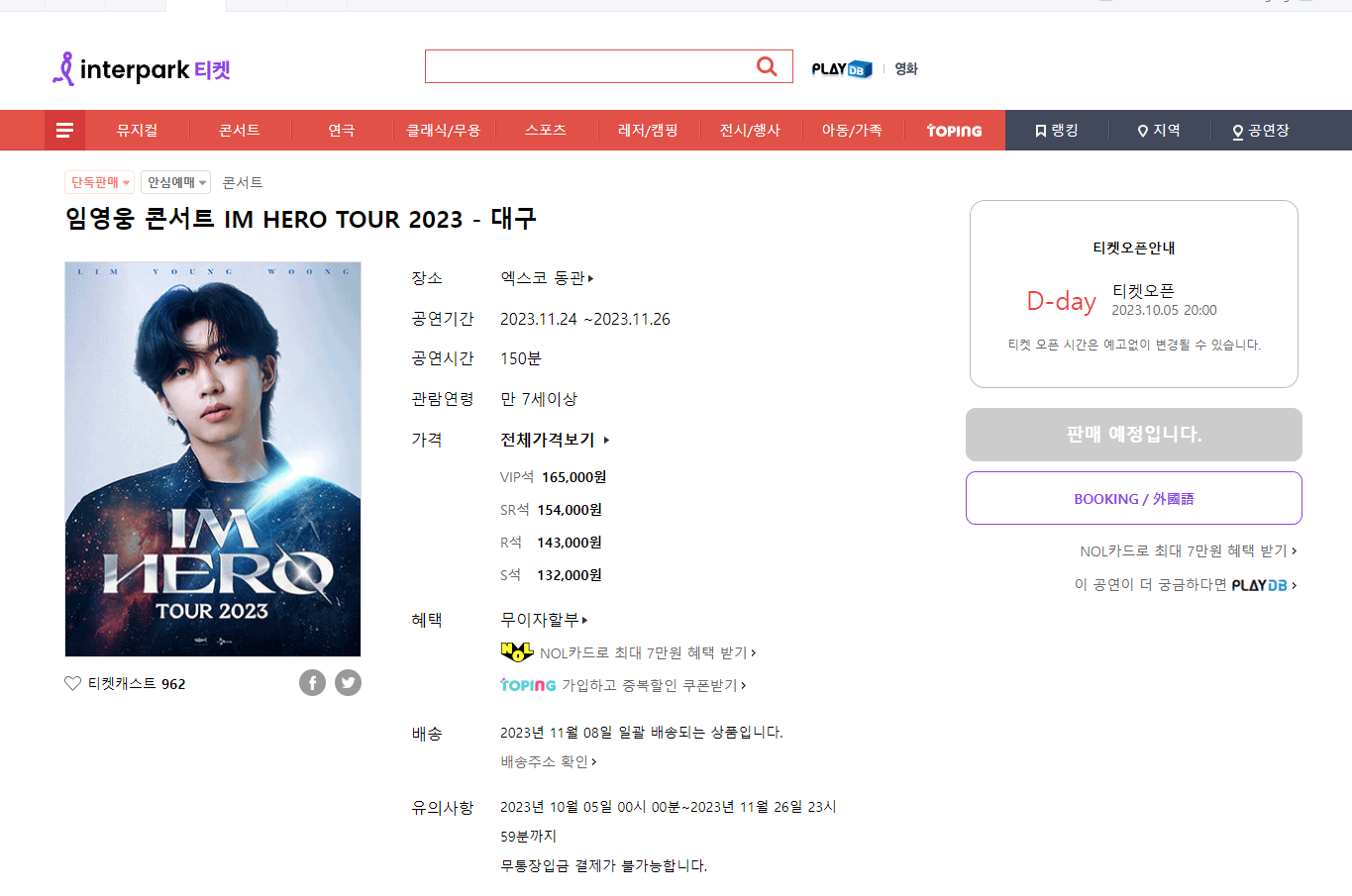 1. 아래의 콘서트 예매하기 바로가기를 클릭하여 인터파크 임영웅 콘서트 예매 페이지로 갑니다.