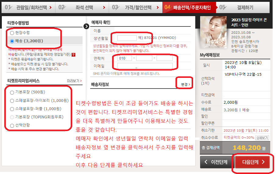 6. 티켓수력방법 선택, 예매자 정보 입력, 프리미엄서비스 선택, 배송주소 등록 후 다음단계를 선택합니다.