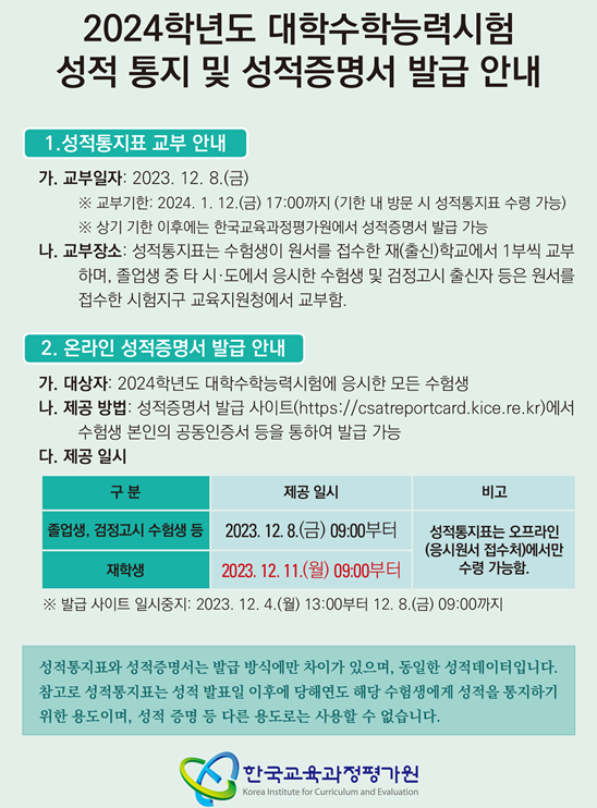 2024학년도 대학수학능력시험 성적 통지 및 성적증명서 발급 안내